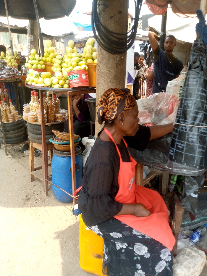 An outdoor market scene in Aba, Nigeria, depicts a busy commercial environment under daylight conditions. In the immediate foreground, an adult female with a medium-dark complexion is seated on a yellow plastic jerrycan. She wears a black, long-sleeved top, a black skirt with a white floral pattern, and a red apron. Her head is covered with an orange and brown patterned headscarf. She wears a gold earring in her right ear and is observed extending her right arm towards a large black plastic bag or sheet, partially obscured by a concrete pillar, while her left arm rests in her lap. To the left of the central figure, a market stall features a two-tiered wooden display stand with metal supports. The upper tier holds multiple yellow buckets filled with green and yellow garden eggs (eggplants), with a red "MAGGI SOUPY" container placed among them. The lower tier displays numerous clear glass bottles containing what appears to be roasted peanuts or similar snacks, alongside smaller, clear plastic containers. This stand is partially supported by stacked dark tires on the far left. Beneath the lower tier, a blue plastic barrel serves as a base for a woven basket holding dried brown produce. Another individual is partially visible, seated in the shade behind this stall. In the mid-ground, a concrete pillar or utility pole, wrapped with black coiled electrical cables, rises centrally. To the right of this pillar, partially obscured by the main subject, an adult male with a dark complexion, wearing a dark t-shirt, stands with his right arm raised above his head, looking towards the observer. Other blurred figures populate the background, suggesting a crowded market. Overhead, various market canopies, including a dark umbrella and light-colored tarpaulins, provide shade. The ground is unpaved, consisting of light brown dirt or sand.