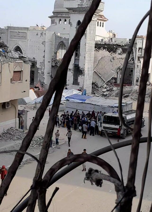 From an elevated perspective, the video shows a scene of apparent devastation. The foreground is obscured by twisted metal bars. In the background, buildings show signs of significant damage and partial collapse, with rubble visible. A crowd of people is gathered in the street, near what appears to be a white van. The individuals are standing, and some appear to be looking in different directions. A white building with a domed roof, likely a mosque, stands partially damaged. The sky is visible and appears clear. The overall impression is one of a post-disaster environment with a focus on recovery and potential humanitarian aid.