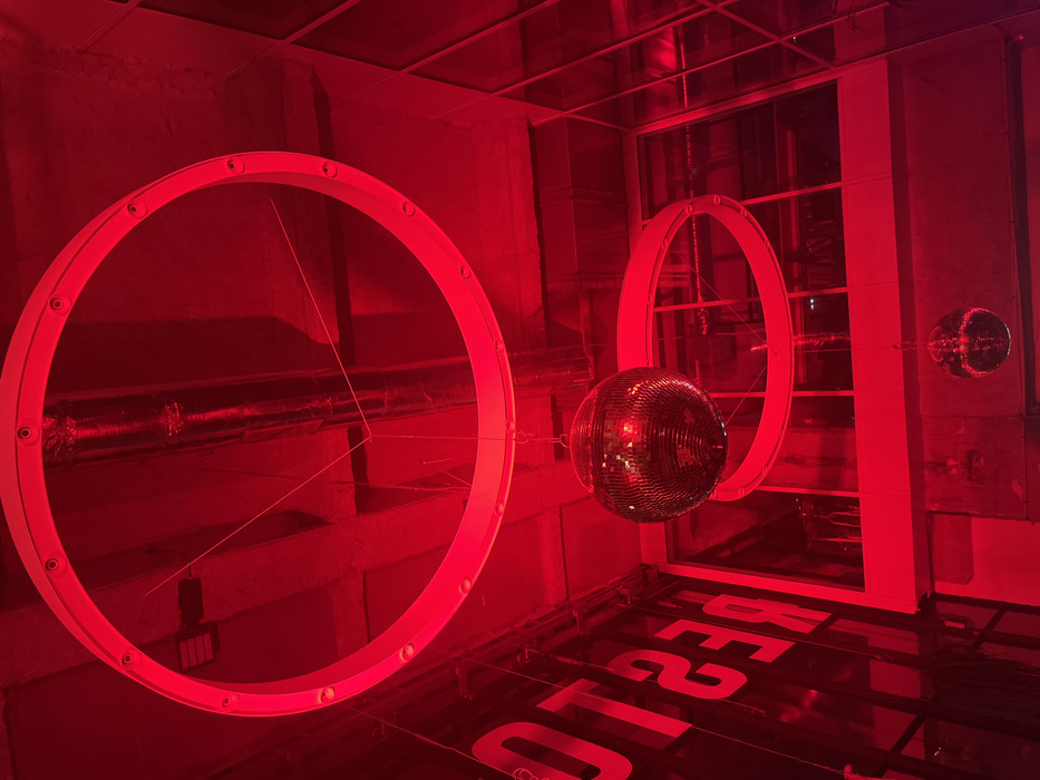 The image depicts the interior of Le Restaurant du Métropole (Le RESTO), located at 173 Boulevard de la Liberté, Lille, France. The scene is saturated in a vibrant red light. The exposed industrial ceiling features metallic ventilation ducts and electrical conduits. Suspended from the ceiling are two large, concentric circular light fixtures, emitting a red glow. A large, mirrored disco ball hangs centrally below the upper circular fixture, while a smaller disco ball is visible lower down, towards the bottom center. On the left wall, large white letters spell "OTSER," indicating a reversed "RESTO" sign. The right side of the image reveals reflective surfaces or large windows with a grid-like frame structure. No individuals or specific actions are visible within the frame.