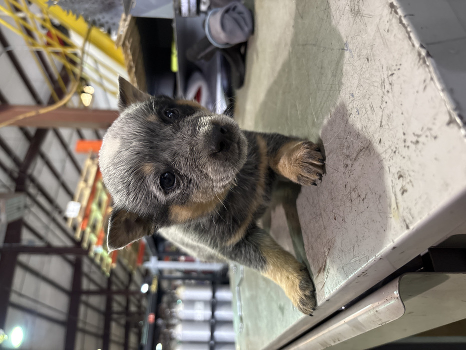 A close-up, slightly tilted shot features a blue heeler puppy on a surface. The puppy has blue-gray fur mixed with tan accents and a black nose. It looks directly into the camera with dark eyes. The background shows a warehouse-like setting with metal structures and shelving. The puppy is positioned on a white, possibly metallic, surface, with one paw reaching towards the camera.