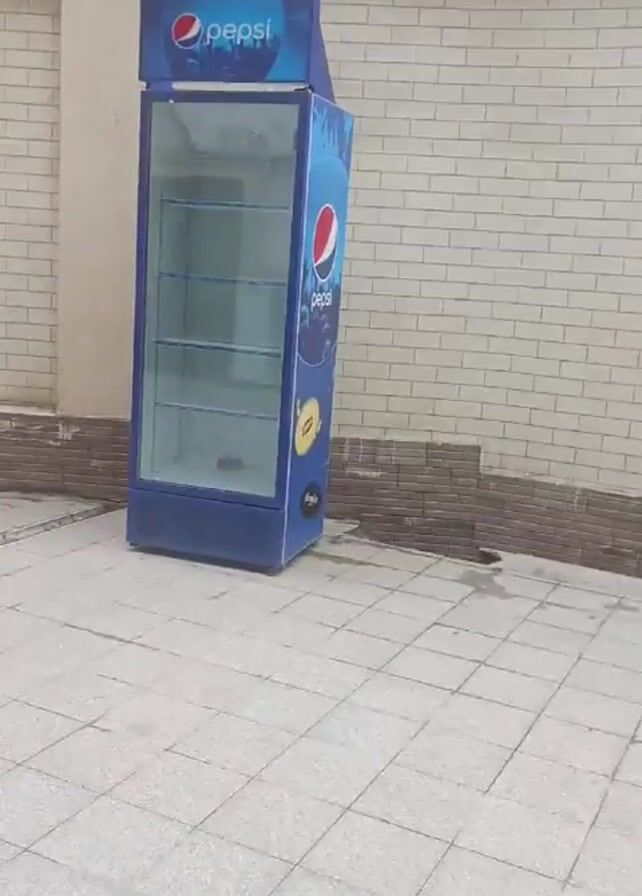 n outdoor view of a tiled walkway situated between a beige brick wall and a beige building. The building has multiple windows and air conditioning units installed on its side. In the initial shot, a blue Pepsi cooler stands against the wall. As the video progresses, the camera moves along the walkway, revealing two people walking in the distance. The walkway features a drainage system running along its length. The scene appears to be a public space or a campus, possibly on an overcast day.