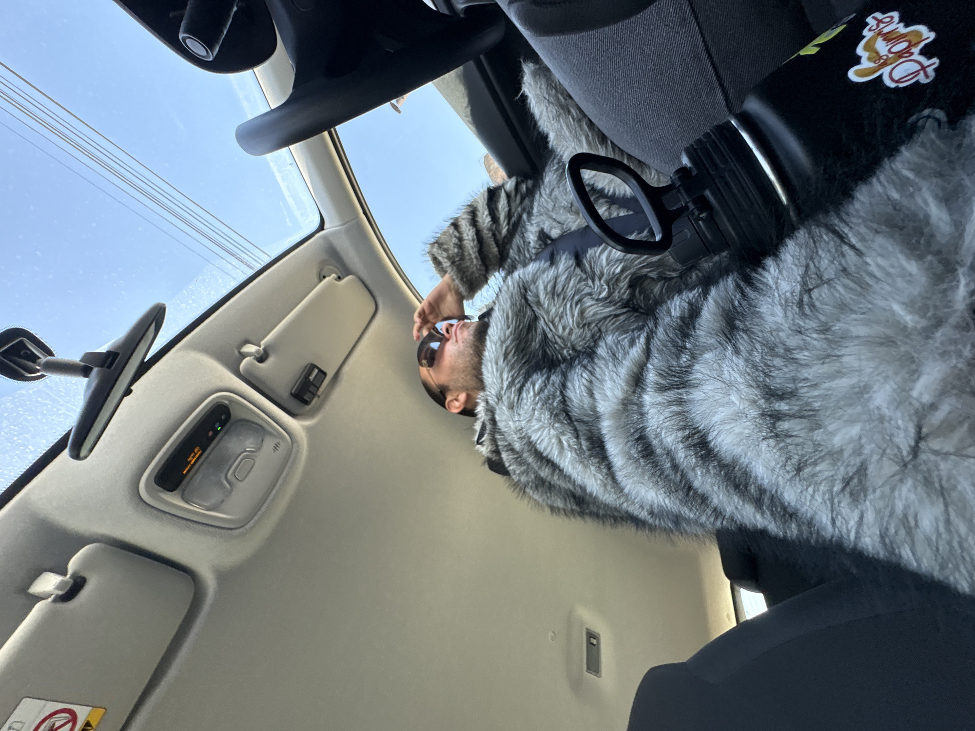 A person wearing sunglasses and a gray and white faux fur coat is sitting in the passenger seat of a car
