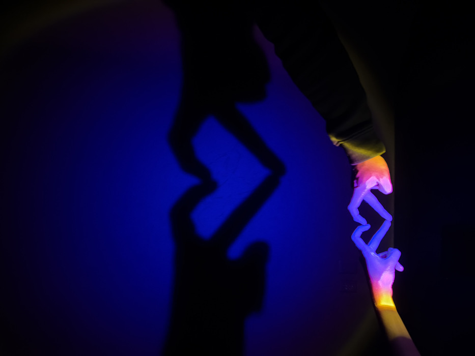 Two hands, illuminated with vivid colors, reach towards each other against a dark background. One hand extends from a shadowed arm, while the other arises from the darkness below. A dramatic shadow of the hands and arm is projected onto a blue wall. The hands themselves glow with shades of pink, purple, yellow and orange, creating a vibrant contrast with the surrounding darkness and shadow.