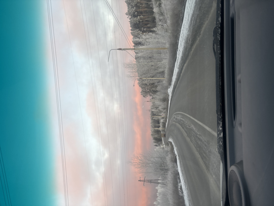 A landscape captured from inside a vehicle showcases a winding road covered in snow, bordering a frost-covered forest. Power lines stretch across a sky tinted with shades of pink and blue, hinting at either dawn or dusk. The view is framed by the vehicle's interior, including a portion of the door and a speaker grill, suggesting a journey through a winter wonderland.