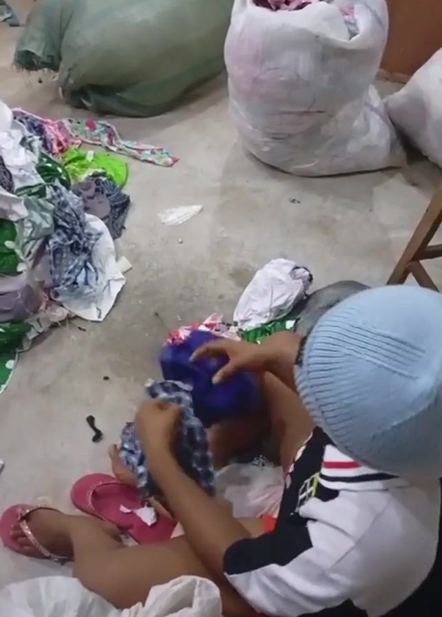 A child wearing a light blue beanie, red shorts, and a white and black striped shirt sits cross-legged on a concrete floor. The child is sorting through a pile of colorful clothes, examining each item and arranging them. Large sacks filled with clothes surround the child, and loose garments are scattered across the floor. The scene suggests a sorting or recycling operation involving textiles.