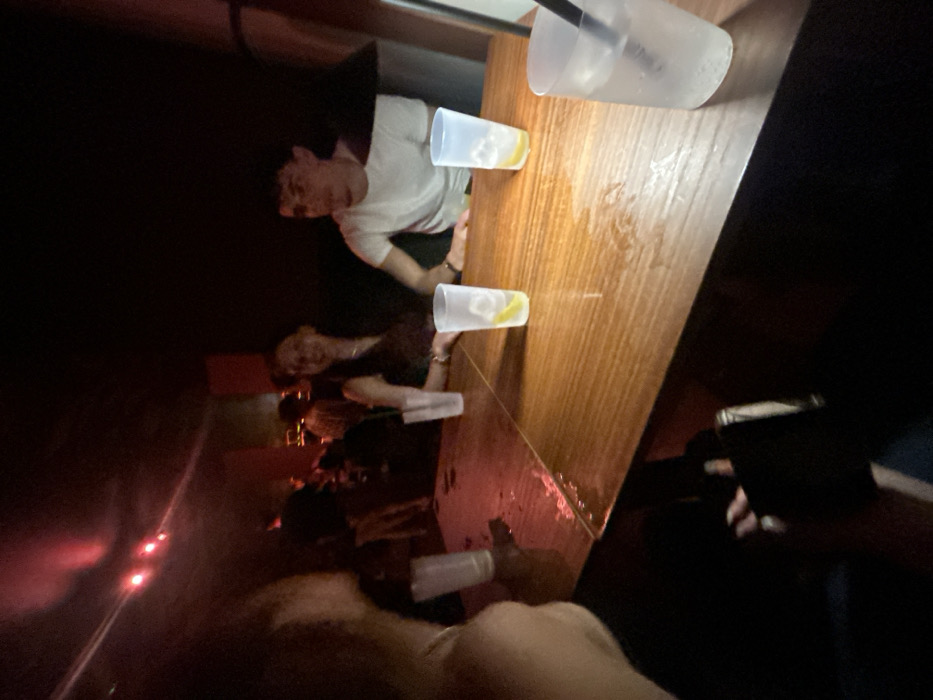 - "The image displays the dimly lit interior of an establishment, consistent with a bar or nightclub, with red ambient lighting sources visible on the ceiling in the background" by FM-YH8cV2, licensed under CC BY 4.0