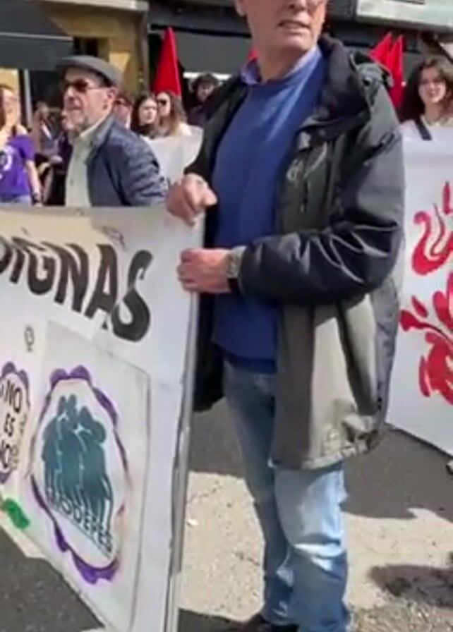 crowd of people marching or demonstrating, presumably a protest or rally, given the signs and banners they carry. The marchers appear to be diverse, including people of various ages and genders. Many individuals hold signs with slogans and messages written in Spanish; one prominent sign reads "Publicas DIGNAS YA". Some people are also carrying red flags, with one red banner stating "adelante las mujeres trabajadoras". A transgender flag is also visible. The event takes place on a city street, with buildings and businesses serving as a backdrop. The overall atmosphere suggests a public demonstration or march advocating for specific causes or issues.