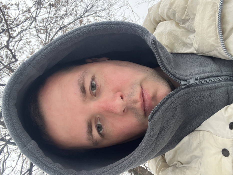 A male individual, appearing to be in his late twenties to early thirties, is depicted in a chest-up, outdoor portrait. He possesses fair skin, light brown hair visible on the forehead, green/light brown eyes, and stubble on his chin and upper lip. The tip of his nose exhibits a reddish discoloration. A small silver hoop earring is visible in his left earlobe. He is wearing a grey fleece hooded jacket, zipped partially, with the hood raised over his head. An outer off-white or light beige puffer jacket, featuring dark circular fasteners on the visible lower left section, is worn over the fleece. The individual maintains direct eye contact with the camera, displaying a neutral expression. The background consists of bare deciduous tree branches, some with sparse dried leaves, lightly coated in snow or frost, set against an overcast, light-colored sky, indicative of winter conditions. This scene is located in the city of Odintsovo, Russia.