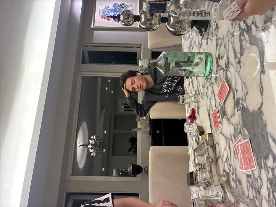 The scene depicts an indoor social gathering, likely within a private residence in Huixquilucan de Degollado, Mexico. The setting is a well-lit room, possibly a dining area or large living space, furnished with modern decor. **People:** 1. A young adult male, approximately 20-30 years old, with short dark hair, is seated at a large table in the center-right of the frame. He wears a dark grey hooded sweatshirt with "PENN" or similar white lettering on the chest. His right elbow rests on the table, and his right hand is placed on the back of his head. His eyes are partially closed, and his facial expression is neutral to contemplative. 2. A partial figure is visible on the far left, standing, wearing a black and white striped short-sleeved shirt. Only their torso and left arm are within the frame. 3. On the far right, the hands of a third person are visible, holding a fan of red-backed playing cards. A single card, possibly a 6 of clubs or spades, is identifiable. This individual is seated at the table. 4. Indistinct figures are visible in the reflection of a large background mirror, suggesting additional individuals are present but not directly in the frame. **Subjects/Objects on the Table:** The central object is a large, polished marble-top table with distinct white and grey veining. * Multiple red-backed playing cards are scattered across the table's surface, indicating a card game is in progress or has recently concluded. One small stack of cards is near the center, and a single card lies to its left. * A tall, clear glass bottle containing a translucent light blue-green liquid (consistent with an alcoholic spirit) stands upright near the center of the table. * An empty, clear glass spirit bottle is positioned to the right of the first bottle. * Three small, clear shot glasses are on the table: one near the seated male, one near the left edge of the frame, and one closer to the foreground. * A partially crushed aluminum beverage can, predominantly white with red markings, is located near the leftmost shot glass. * A rectangular, ornate silver-colored metal tray, approximately 20 cm in length, holds a silver-colored lighter or small box and other small, dark, unidentified items. * A small, red, plastic or ceramic object, roughly 5 cm long and abstractly shaped, is near the seated male's shot glass. * A decorative centerpiece, consisting of three stacked, reflective silver spheres, is situated on the right side of the table, behind the bottles. **Environment:** The room features light-colored walls (off-white or beige). A large, framed mirror or window occupies the central background, reflecting an ornate, multi-tiered black chandelier hanging from a recessed circular ceiling feature. Additional recessed ceiling lights are visible in the reflection. Behind the seated male, a dark-colored credenza or sideboard holds decorative items, including a tall, black urn-shaped vase and clear glass decanters. Upholstered dining chairs with light beige fabric backs are positioned around the table. On the far right wall, a framed piece of artwork depicts a stylized blue and red rooster. Overhead artificial lighting illuminates the entire scene.