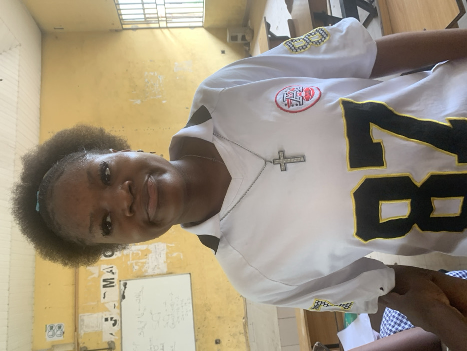 The image depicts a young Black female in a medium shot within a classroom setting in the city of Ihiagwa, Nigeria