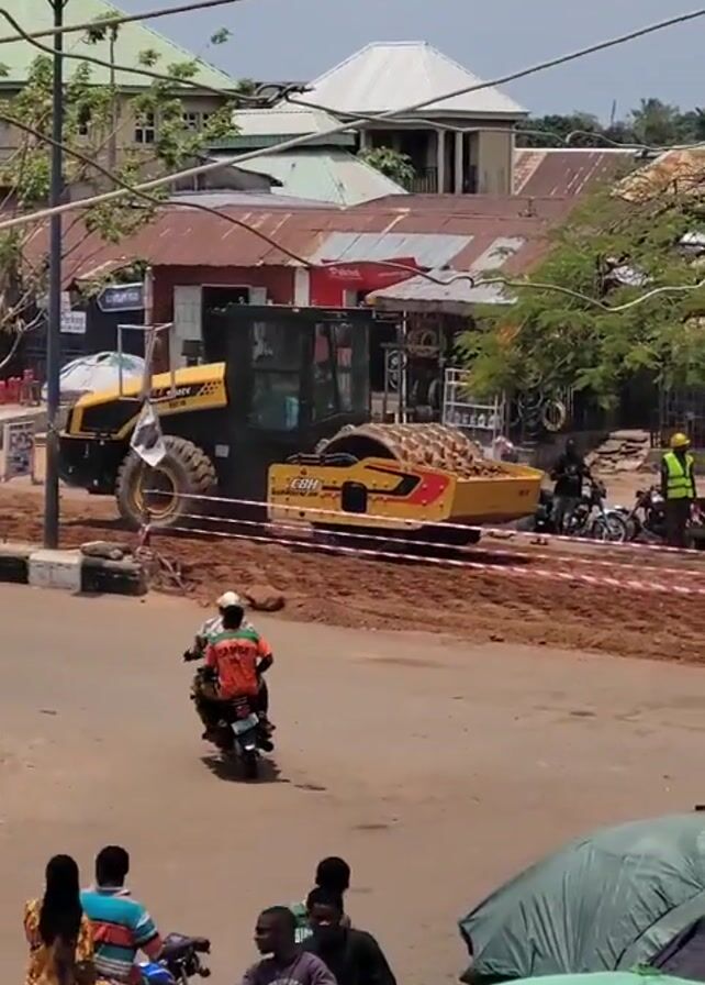 road construction scene. A yellow SANY SSR120-3 road roller sits on the road, which is partially covered in reddish-brown dirt. There are two motorcycles passing by in the foreground, each with two people riding. Several people are gathered nearby, some standing and others on motorcycles. In the background, there are various buildings with metal roofs, trees, and power lines. A construction worker in a yellow vest stands near a barrier of red and white tape. The sky is overcast.