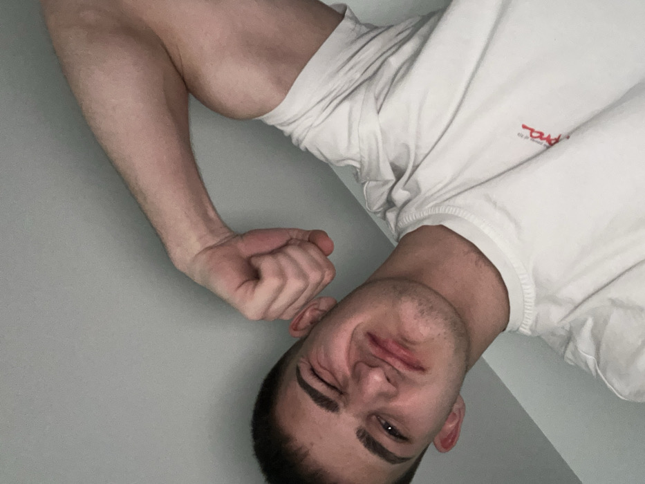 A close-up, upward-angled selfie depicts a young adult male indoors against a plain light grey wall