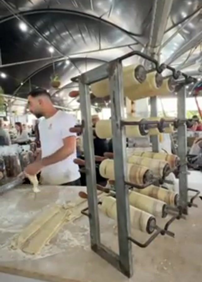 A bearded man in a white T-shirt stands at a table covered in flour, rolling out pieces of dough with a rolling pin. In front of him is a metal rack holding several cylindrical, tan-colored pastries wrapped around wooden dowels. Other people are visible in the background, suggesting a market or food venue. The area is covered by a metallic awning with hanging plants.