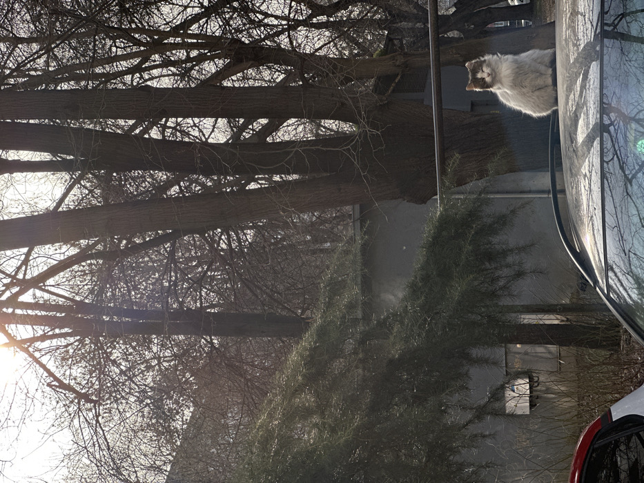 The scene depicts an outdoor urban environment within the city of Plovdiv, Bulgaria, under bright daylight conditions. A long-haired, bi-color cat, primarily white with brown/ginger markings on its head and tail, sits upright and centered on the glossy roof of a dark-colored passenger vehicle. The cat faces slightly right, appearing to squint in the strong sunlight originating from the upper left of the frame. Reflections of bare tree branches are visible on the car's windshield. To the left, a portion of a red and white vehicle is partially visible. Behind the cat and car, a dark, horizontal metal bar is present. Further back, a plain grey building facade is visible, featuring a white utility box and a metallic utility box mounted on its surface. The background consists predominantly of numerous deciduous trees with bare branches, suggesting a late autumn or winter season. The sunlight creates distinct shadows and lens flare. No human figures are present.
