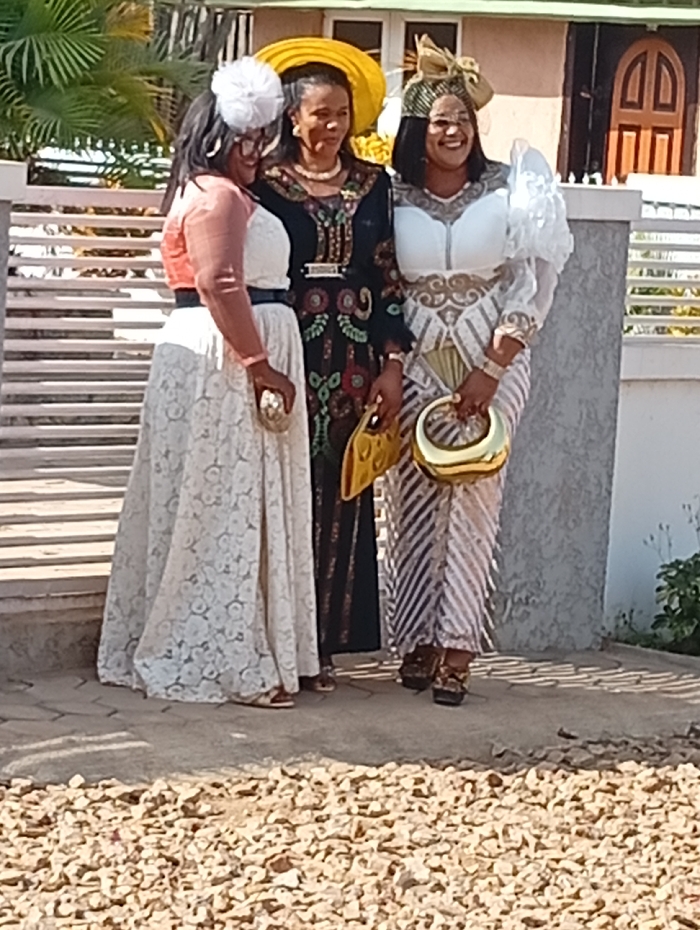 The image displays three adult females standing outdoors in daylight on a paved surface, with light-colored gravel covering the immediate foreground. The woman on the left wears a white, floor-length dress, possibly made of lace, cinched with a black belt. She has a short, coral-colored bolero jacket over the dress and a white, textured fascinator in her dark hair. She carries a small, light-colored clutch bag and wears light-colored sandals. Her expression is a slight smile, looking downwards and to her left. The central woman is dressed in a long, dark garment featuring intricate, colorful embroidered patterns. She wears a large, wide-brimmed yellow hat and a necklace. Her hands are at her sides, and she has a faint smile, looking slightly to her left. The woman on the right wears a white and gold-patterned outfit, consisting of a top with prominent puffed sleeves and a skirt-like lower portion with diagonal stripes and geometric motifs. She has an elaborate gold-colored headwrap, significant gold-toned jewelry including a wide bracelet, and holds two distinct gold-colored handbags, one crescent-shaped and the other rectangular. She wears dark platform sandals with embellishments. Her expression is a broad smile, looking directly at the camera. Behind the subjects, a white horizontal slatted fence or gate is visible on the left, transitioning to a light-colored concrete wall on the right. Further in the background, a building with a green roof and a dark wooden arched door is partially visible, flanked by some green foliage on the far right. The precise location within the city of Jos, Nigeria, cannot be determined from the visual information presented in the image.