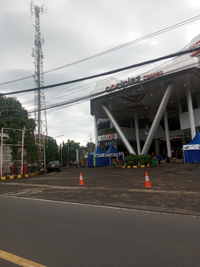The scene depicts a commercial area in Ariyalai, Sri Lanka, under an overcast sky. In the foreground, an asphalt road with a partial yellow demarcation line is visible, with two orange traffic cones positioned on a paved lot immediately beyond the road. The midground features a large, paved parking area. A dark-colored sedan and a motorcycle are parked on the left side of this area. Several blue canopy tents are erected, with some green and white signage partially visible on the tents. Multiple individuals are present, some walking near the tents and others closer to the main building entrance. The background is dominated by a multi-story commercial building. The building features large, angled grey support pillars at its prominent entrance. Signage on the building's facade clearly reads "OPICPLAZ CINEMAS" at the top, and further down, "SiCO" and "MAKO" logos are visible. To the left of the building, a tall, grey lattice communication tower equipped with multiple antennas extends upwards against the sky. Utility lines traverse horizontally across the upper portion of the frame. On the far left, a red fire hydrant stands near a low barrier with yellow and black markings. Trees and sparse vegetation are visible around the perimeter of the parking area and near the base of the tower.