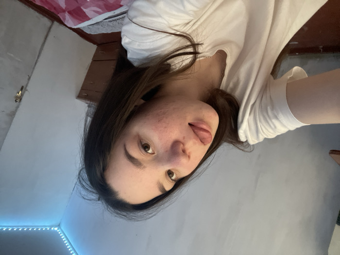 The image depicts a young female captured in a selfie indoors, located in the city of Ольховка, Russia. The subject, angled slightly to the left, has long dark brown hair and light brown eyes. She is wearing a white t-shirt and a thin silver-colored necklace. Her mouth is open with her tongue extended outward. Visible skin on her face, particularly on the cheeks, shows areas of redness. The background features light-colored walls. Blue LED strip lighting is affixed along the upper right wall corner, casting a subtle blue hue. On the right side of the frame, a light brown wooden dresser with multiple drawers is visible. Further right, a white door with a gold-colored handle is partially seen. In the lower right corner, a red and white patterned blanket or comforter is present, consistent with a bed. A dark-colored floor is visible at the bottom.