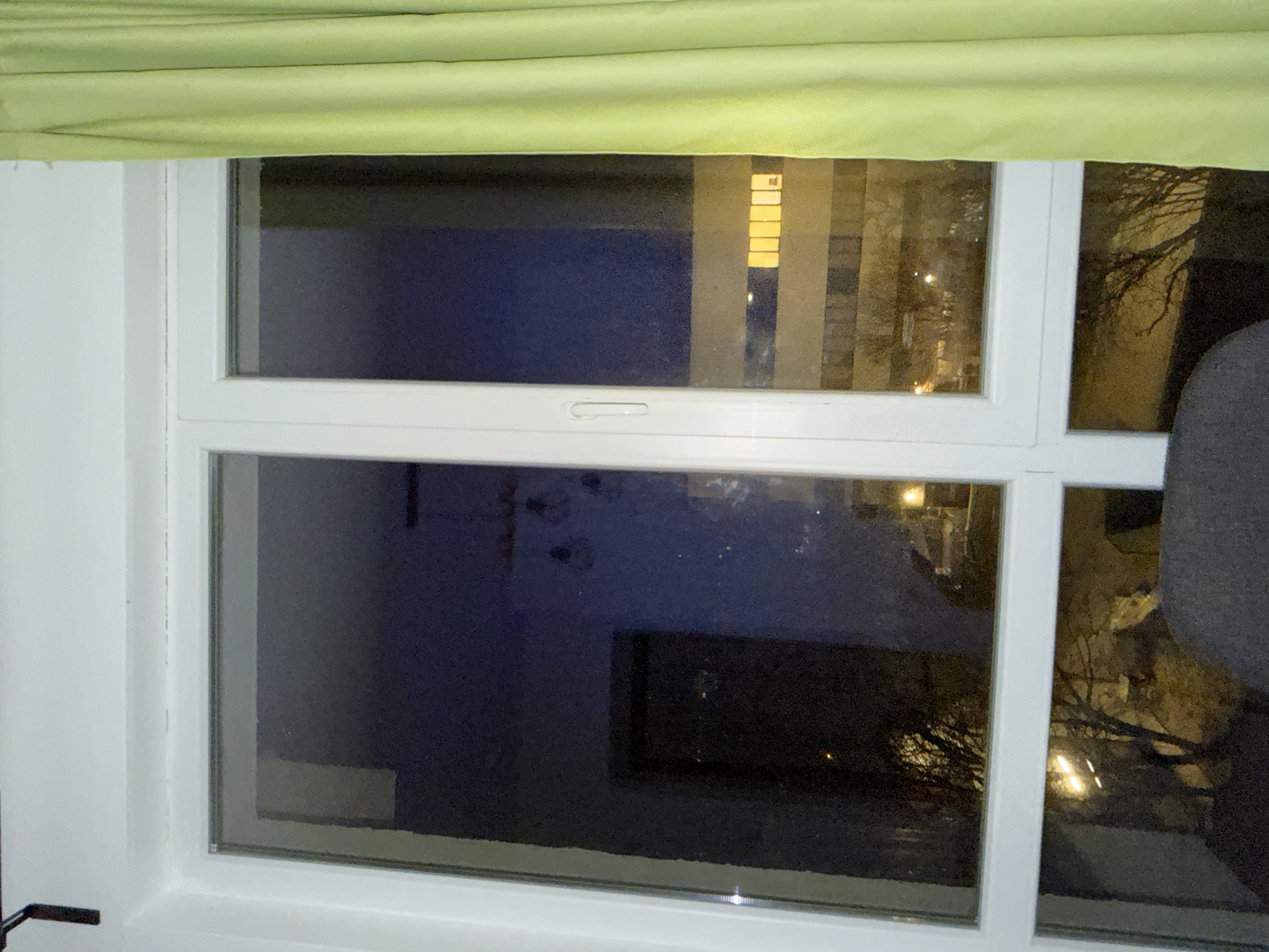 The image displays a nighttime view observed from an interior window located in Varna, Bulgaria. The foreground is dominated by a white-framed window structure divided into multiple panes. A light green curtain partially covers the right side of the window. Reflections within the glass reveal elements of the interior room: a dark ceiling with a multi-bulb light fixture is visible in the upper-left pane, and a large, dark rectangular shape, possibly a door or piece of furniture, is also reflected on the left side. A dark gray, upholstered object, likely the back of a chair or sofa, occupies the bottom-center foreground, slightly obscuring the view through the lower panes. Beyond the window, the exterior is dark, characteristic of nighttime. Scattered artificial lights are visible, including distant streetlights and illuminated areas from other structures. Bare tree branches, devoid of leaves, are discernible against the dark landscape, suggesting a winter or early spring setting. In the mid-ground, a section of a building is visible, featuring a series of rectangular windows emitting yellow light, indicating interior illumination. No individuals, specific actions, or direct interactions are observable within the depicted scene.