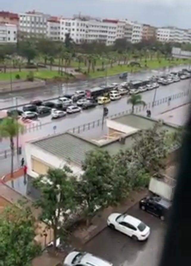 The video, taken from an elevated perspective, shows a city street on a rainy day