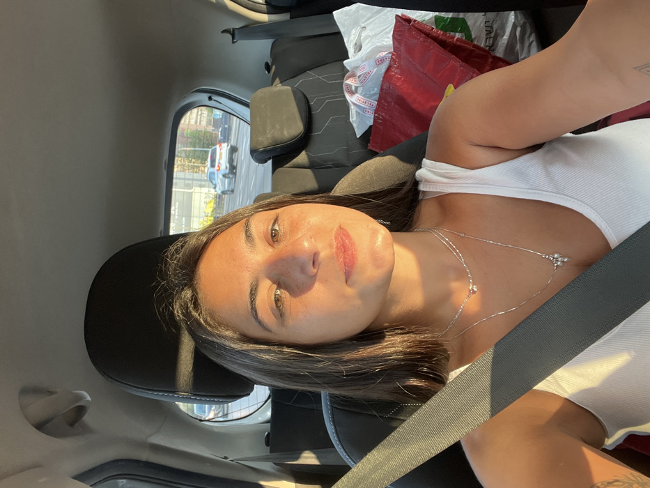 A young female with dark hair, brown eyes, and a tanned complexion is depicted in the front passenger seat of a vehicle