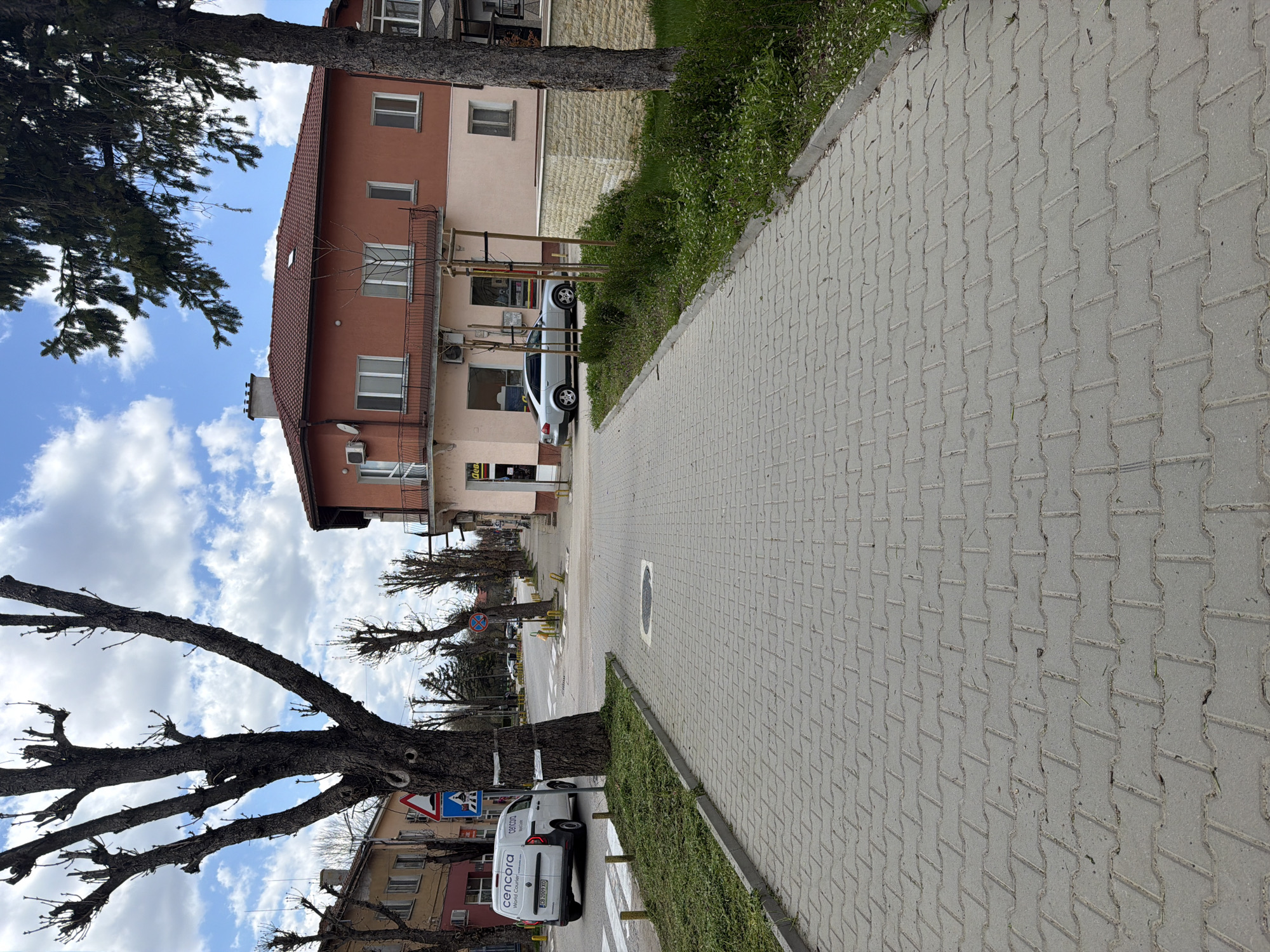 The image depicts a street scene in Dolni Dabnik, Bulgaria. A wide, paved sidewalk occupies the foreground, constructed from interlocking gray concrete pavers. Adjacent to the sidewalk is a narrow strip of grass and low vegetation. Along the street, there are buildings, including a two-story structure with a peach-colored facade and a red tile roof. A white car is parked along the curb in front of the building. Further down the street, a white van bearing the logo of "Cencora World Courier" is parked on a crosswalk. Tall, bare trees line the street, their branches reaching into a blue sky dotted with white clouds. Road signs are visible near the van. The overall impression is of a quiet, urban street on a bright day.