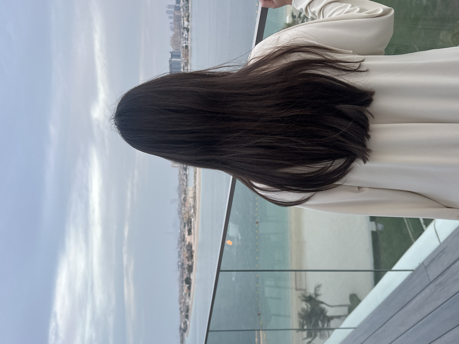 The image displays a person, viewed from behind, standing on a high-rise balcony located in Dubai, United Arab Emirates. The individual has long, dark, straight hair extending to the mid-back and is wearing an off-white, long-sleeved garment. Their right hand rests on the dark horizontal rail of a clear glass safety barrier. A wooden deck floor is visible in the lower left foreground. Beyond the barrier, a sandy beach with two distinct palm trees on the left transitions into the light blue-green waters of the Arabian Gulf. Across the water, landforms consistent with the Palm Jumeirah are visible, featuring developed areas with buildings. The distant horizon reveals the Dubai city skyline, prominently featuring the slender silhouette of the Burj Khalifa slightly left of center. The sky above is uniformly overcast with grey clouds.