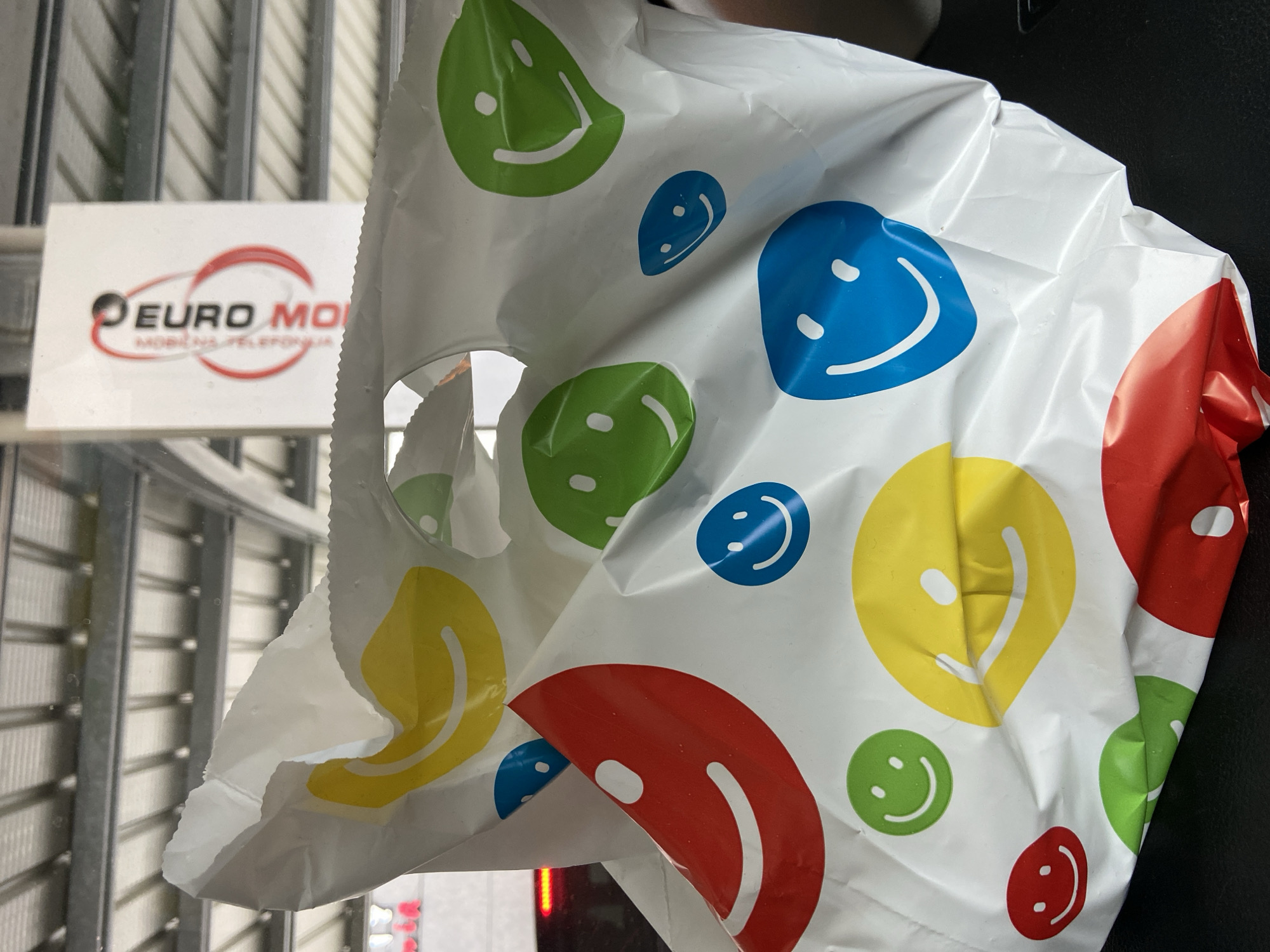 A crinkled white plastic bag, featuring multiple circular smiley face graphics in red, yellow, green, and blue, occupies the foreground and midground, resting on a dark, flat surface