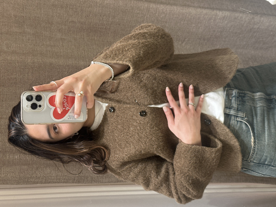 A person takes a mirror selfie wearing a brown, wooly cardigan over a white top, paired with light wash jeans. The person holds a phone with a clear case and a heart sticker, showcasing a bracelet and rings on their fingers. The background appears to be a carpeted floor and a white baseboard.
