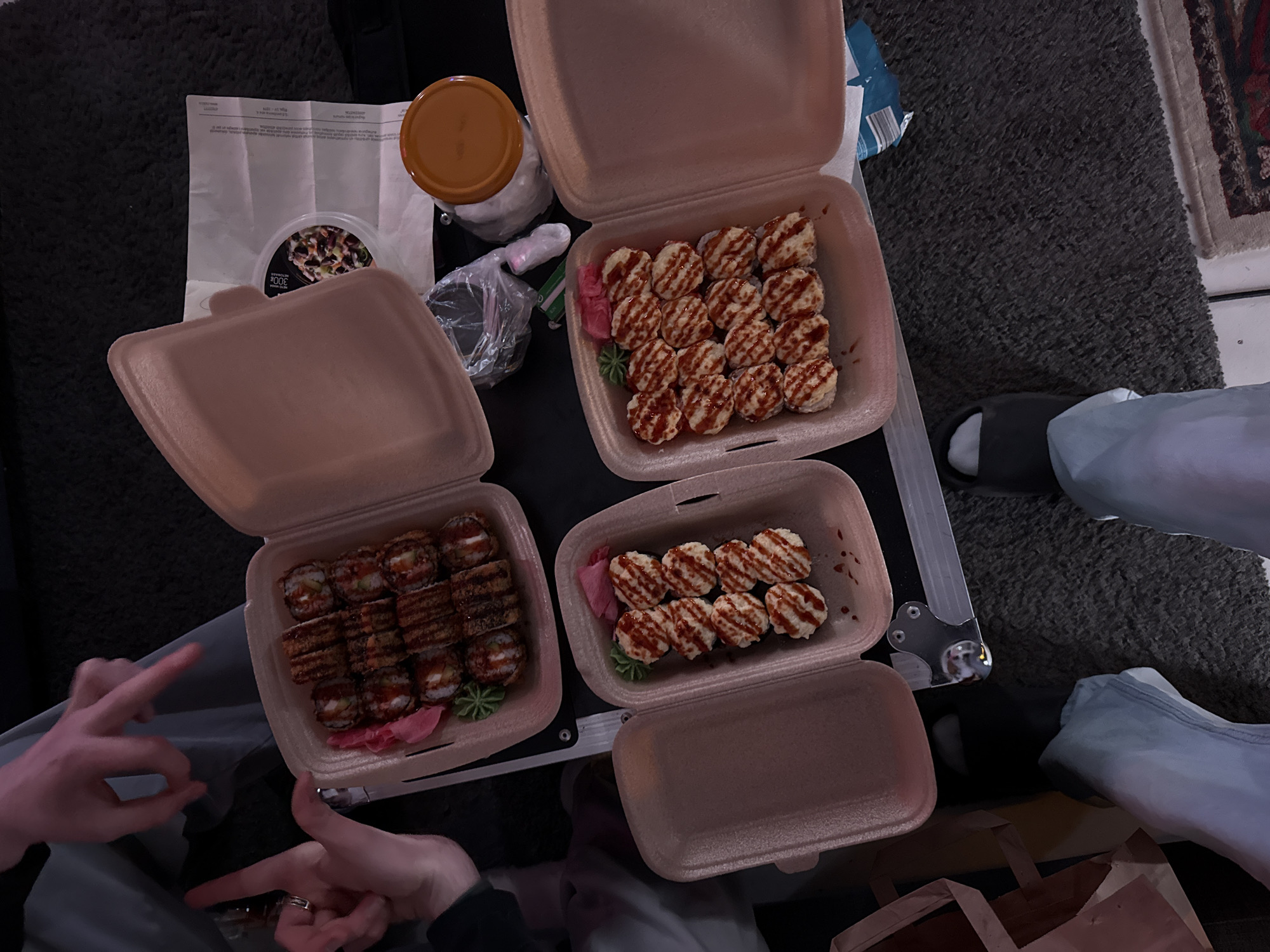 close-up, high-angle view of a spread of sushi in takeout containers, placed on a dark surface that appears to be either a table or the floor