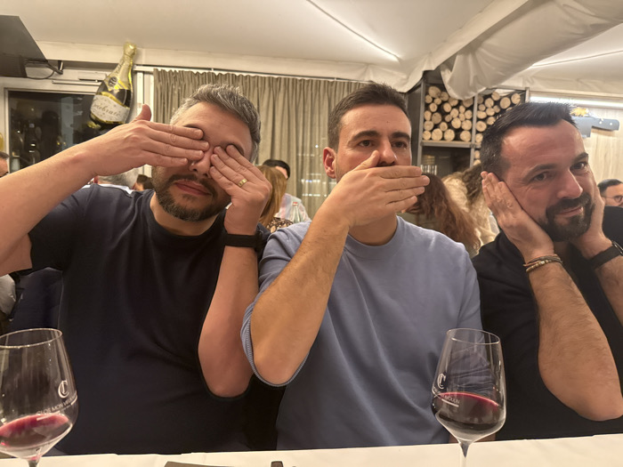 Three men are seated at a table in what appears to be a restaurant. Each man is demonstrating a different action: the man on the left covers his eyes with his hands, the man in the center covers his mouth, and the man on the right covers his ears. In front of each man is a wine glass filled with red wine. A champagne bottle balloon is visible in the background, along with other people dining.