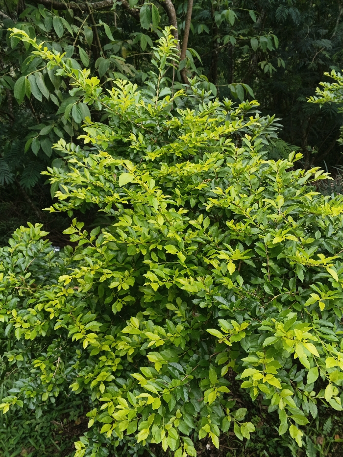 The scene depicts a dense, verdant bush or shrub in Baglung, Nepal. The plant's foliage displays varying shades of green, with brighter chartreuse-green leaves indicating newer growth, interspersed with darker green, mature leaves. The bush is well-foliated, occupying most of the frame, and appears healthy. In the background, indistinct, darker green foliage from other trees and vegetation is visible, suggesting a natural outdoor setting such as a garden or wooded area. No human subjects, animals, or man-made objects are present within the frame. The ground beneath the bush is partially visible, showing dark soil and some minimal ground cover. The lighting is even and diffuse, without harsh shadows.