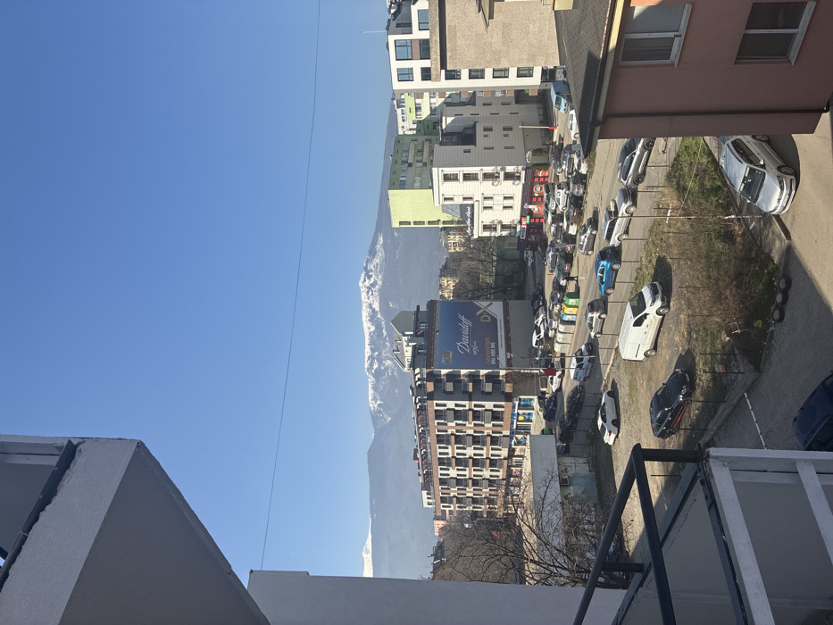 The image depicts an urban landscape in Sofia, Bulgaria, viewed from an elevated position, likely a balcony
