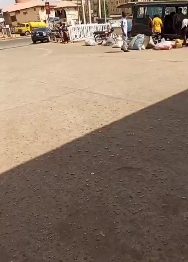 The video depicts a scene at what appears to be a transportation or waiting area. Initially, the camera shows a gas station setup, then pans to reveal a black van parked beside a pile of luggage, including multiple sacks, with several people milling around it. A motorcycle is also parked nearby. The surrounding environment includes buildings, streetlights, and power lines. The area appears to be a paved lot with a concrete or asphalt surface. The video is taken during daytime under bright sunlight.