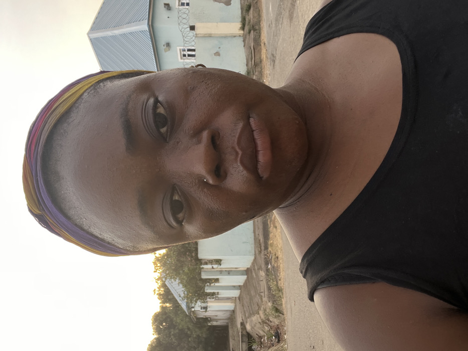 A close-up portrait features a dark-skinned individual with a colorful headband. The person has a nose ring, and their expression is neutral. The image is taken outdoors, with a street and buildings visible in the background, suggesting a residential or urban setting. The lighting indicates either early morning or late afternoon.