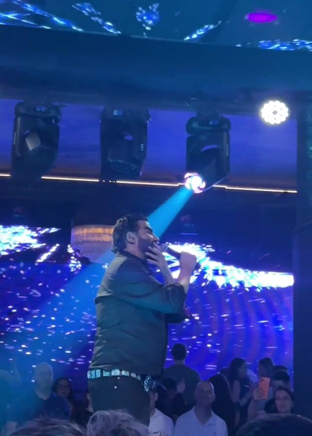 A man sings on stage in a nightclub. He wears a black shirt, dark pants, and a studded belt. He holds a microphone and gestures while singing. The stage is lit with blue and purple lights, including spotlights. Confetti or glitter is visible in the air. A crowd of people stand in front of the stage, some holding up their phones to record the performance. The room is crowded.