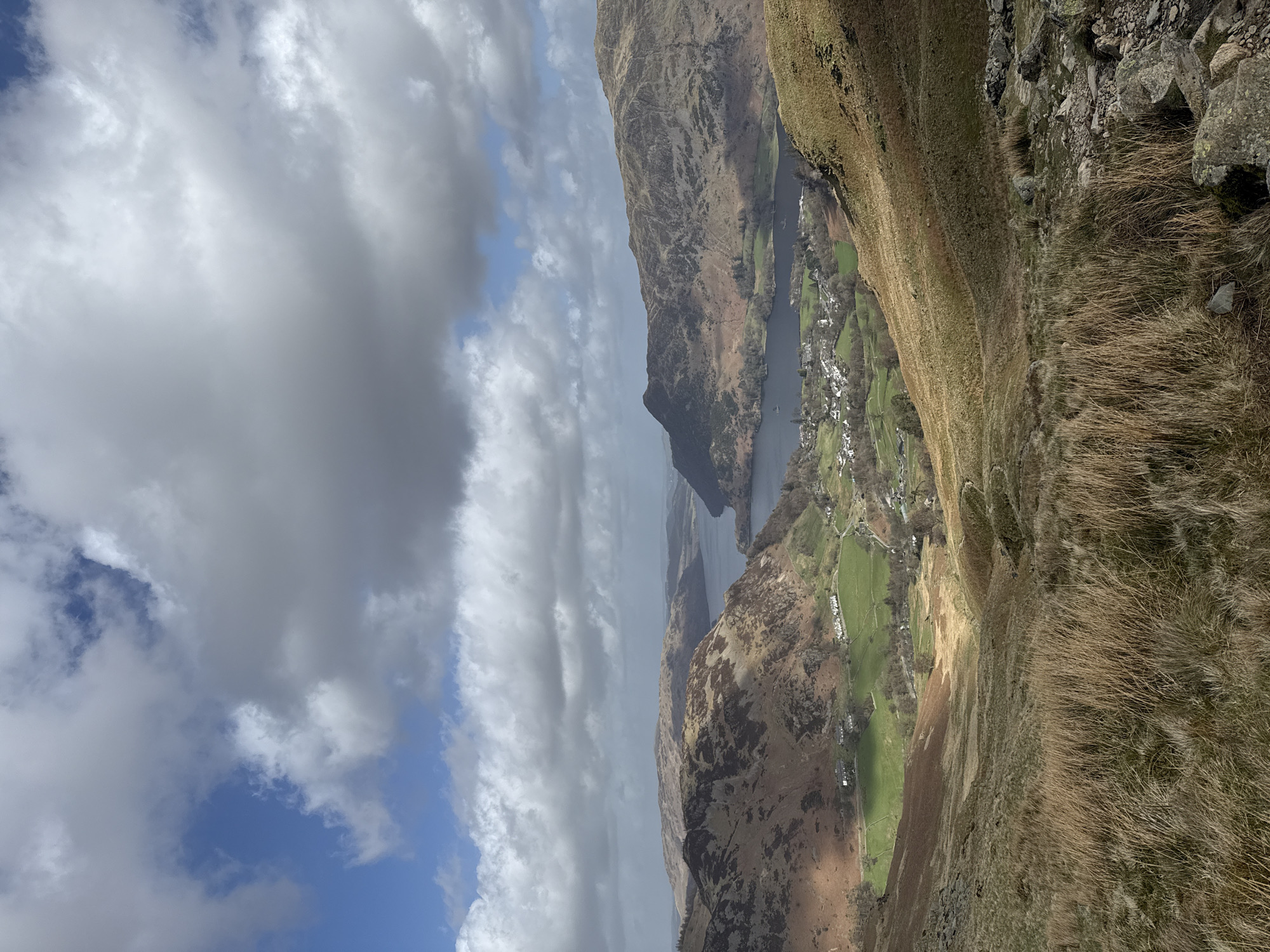 The image displays an elevated panoramic view of the Glenridding valley and Ullswater lake, located in Glenridding, Cumbria, United Kingdom. The foreground features a steep, grassy slope covered in dry, light brown and green grasses, with scattered rocks and a descending dirt path. In the midground, the village of Glenridding is visible, composed of a cluster of white-colored buildings and structures nestled within verdant green fields and interspersed trees. Adjacent to the village, the dark blue surface of Ullswater lake extends, with several small, white objects on its surface, consistent with boats. The lake and village are framed by undulating mountains and fells, displaying a mosaic of brown, ochre, and green vegetation, with areas of exposed rock. The sky occupies the upper portion of the frame, characterized by a mix of clear blue patches and extensive white and grey stratocumulus clouds, casting dynamic shadows across the landscape. No individuals or direct actions are depicted.