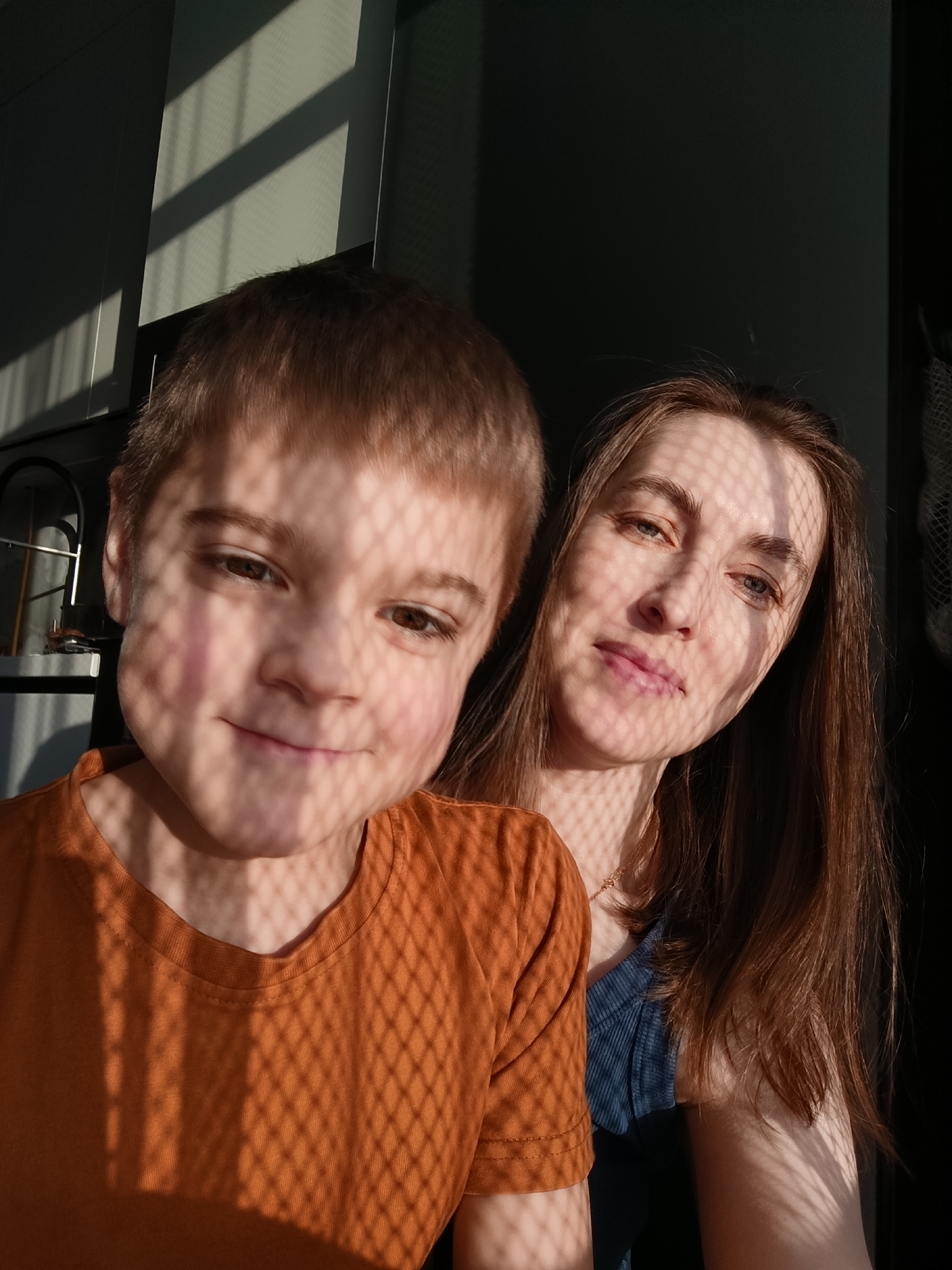 A photograph depicts a woman and a young boy, likely a mother and son, posing indoors with a geometric shadow pattern cast across their faces and clothing. The boy is in the foreground, wearing an orange t-shirt, while the woman is behind him, wearing a blue top. The light source, likely the sun, creates the shadow pattern, suggesting a window with a patterned screen or blinds. The presence of a kitchen sink with a rack suggests the location is likely the kitchen. The location is Chaikovsky, Russia.