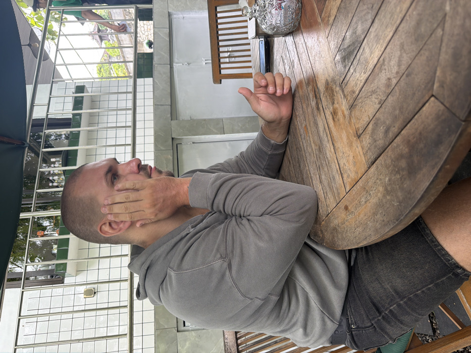 A man in a gray hoodie and dark shorts sits at a wooden table with his hand covering his face. The table has a decorative glass bowl on it. The background features a patio with a tile wall, a metal railing, and some greenery. The angle of the shot is slightly rotated, making the scene appear tilted. The man seems to be outdoors, possibly in a cafe or restaurant setting.