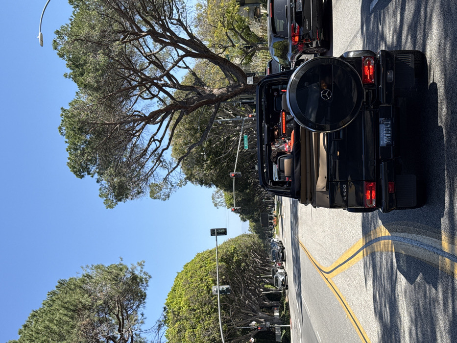 The image captures a street scene on Wilshire Boulevard in Beverly Hills, California, USA, under a clear blue sky. In the foreground, the rear of a black Mercedes-Benz G 500 convertible is visible, with its tan soft top folded down. A spare tire cover, bearing the Mercedes-Benz logo, is mounted on the tailgate. The California license plate "9RWD141" is affixed to the vehicle. Dark, unidentifiable forms, indicative of occupants, are visible within the open cabin. The G 500 is positioned in the rightmost lane, adjacent to a painted median featuring double yellow and a blue line. Directly behind and to the right of the G 500, a black Honda MDX is partially visible. Further down the street, multiple traffic signals are present, with one indicating a green light for through traffic, while a closer signal appears red. The asphalt road is lined on both sides by mature trees with dense green foliage, casting shadows across the pavement. Additional vehicles are present further down the tree-lined boulevard.
