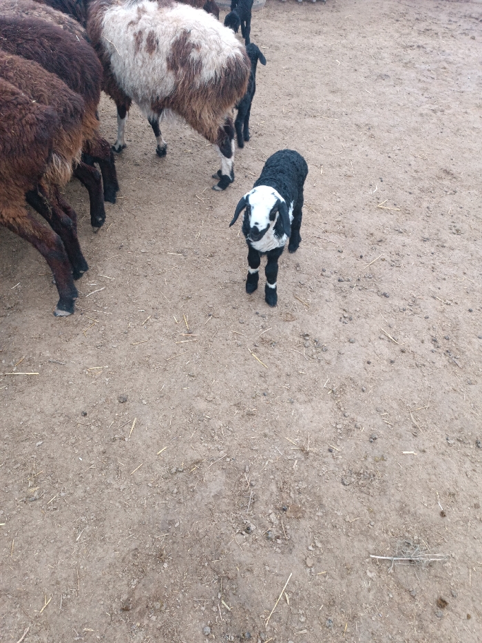 The scene depicts an outdoor, unpaved animal enclosure in Qoraobdol QFY, Uzbekistan. In the foreground, a young lamb with black wool and a distinctive white face and white lower legs stands, facing forward. To its upper left, an adult sheep with primarily dark brown wool is partially visible. Adjacent to it, another adult sheep is seen with a white body marked by brown patches on its back, featuring black and white hooves. In the upper right background, a smaller black animal, possibly another lamb, is partially visible. The ground consists of light brown, dry earth, sparsely scattered with straw fragments and small dark pellets. The animals appear stationary.