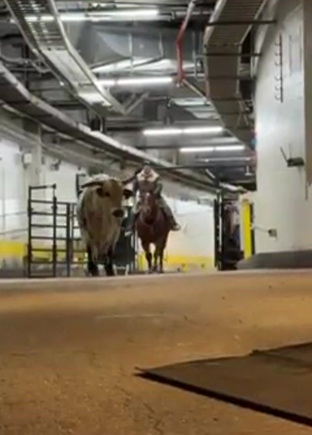 person on horseback chasing a bull down a corridor. The corridor appears to be in a building, with exposed ductwork and conduits running along the ceiling. The horse and rider are following the bull, moving from the background towards the camera. A person in a white coat stands in the background by a gate. The bull is light brown with dark speckles. The horse is brown.