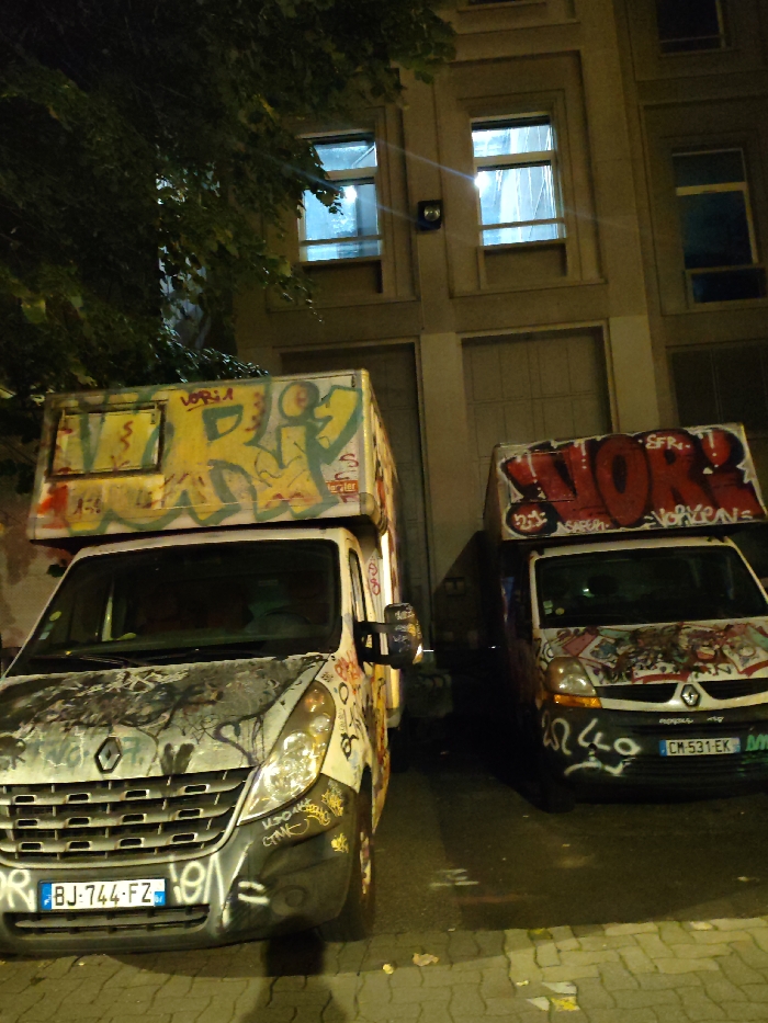 - "This nighttime image depicts two heavily graffitied box trucks parked on an urban street in Strasbourg, France, adjacent to a multi-story building" by FM-S8GQG3, licensed under CC BY 4.0