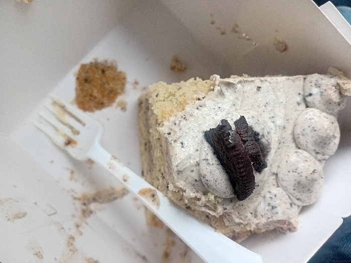 - "The image displays a partially consumed slice of cookies and cream cake contained within a white cardboard takeaway box" by FM-FCCQg2, licensed under CC BY 4.0