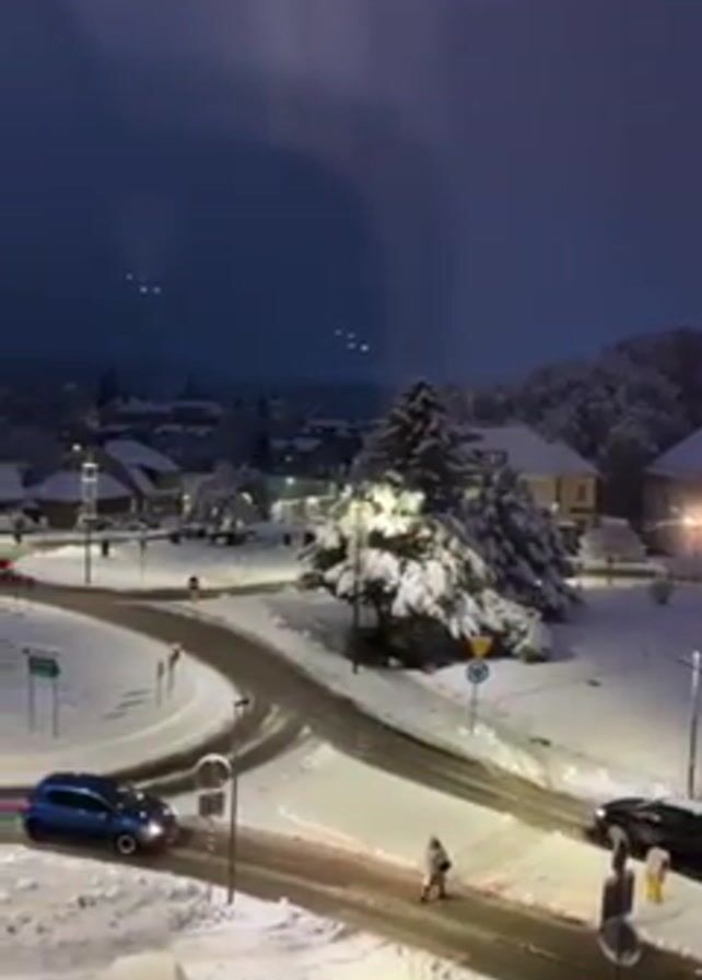 snow-covered roundabout in a small town at dusk or dawn. Cars are driving through the roundabout, and a pedestrian is crossing the street. The scene is viewed from an elevated position, likely from a window. Snow covers the roads, buildings, trees, and parked cars. The sky is a dark blue. The lighting is dim, with streetlights illuminating the area. The video seems to be shot through glass, as reflections are visible.