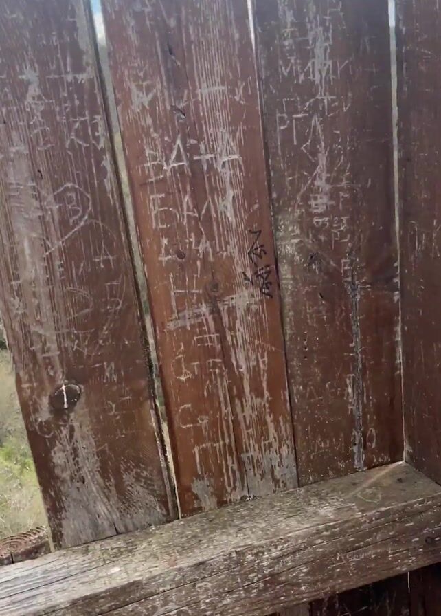 view from what appears to be a wooden lookout point or tower. The structure has multiple wooden planks, some of which are heavily scratched and covered in carvings and graffiti, including dates and initials. The camera then pans to showcase the view, which includes a steep, wooded valley or gorge. The landscape is predominantly covered in trees that appear leafless, possibly during late fall or early spring, with patches of rocky terrain and limited green vegetation. The sky above is overcast with clouds.