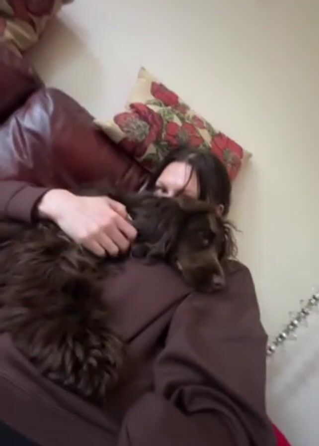 A person wearing a brown sweatshirt is lying on a brown leather couch with two pillows behind their head. They are holding a brown dog close to their chest, petting it. A floor lamp stands nearby.
