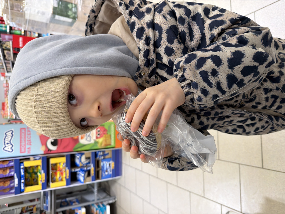 A young child, approximately 4-6 years old, is depicted in a retail grocery store in Perm, Russia, actively eating a donut