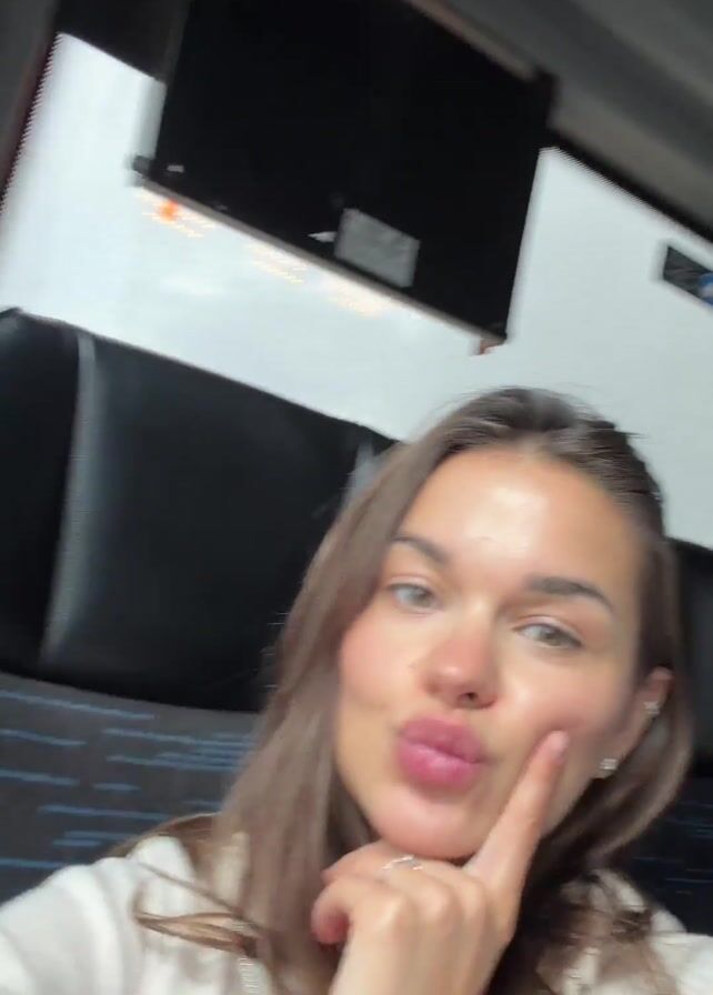 A woman takes a selfie on a bus and then turns the camera to show the dry, desert landscape outside the window. She turns the camera back to herself. She is wearing a white hooded sweatshirt, jeans, and several pieces of jewelry. She has brown hair and green eyes.