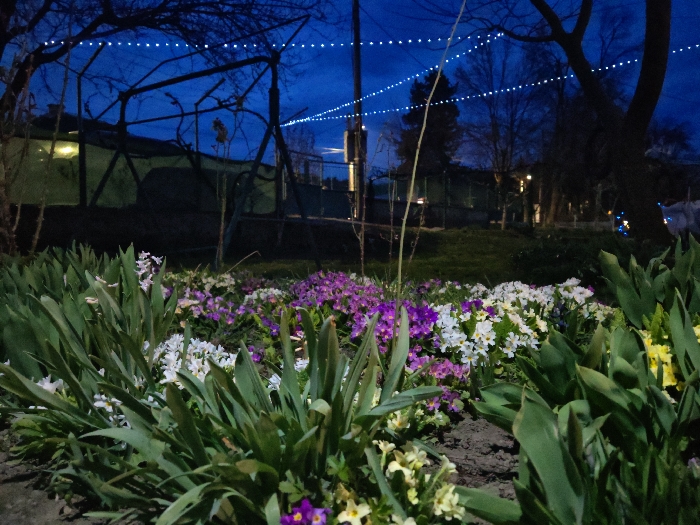 The scene depicts an outdoor garden or park at night in Etropole, Bulgaria. In the foreground, a cultivated flower bed displays numerous green-leaved plants and dense clusters of white, purple, and yellow primroses on dark soil. The midground features a grassy area with a dark, unoccupied skeletal metal structure, possibly playground equipment, on the left, backed by a fence. A large tree trunk with bare branches is visible on the right. The background consists of a dark blue sky horizontally traversed by multiple parallel strings of small, illuminating white lights. Faint, distant artificial lights are discernible on the horizon. No individuals are present.