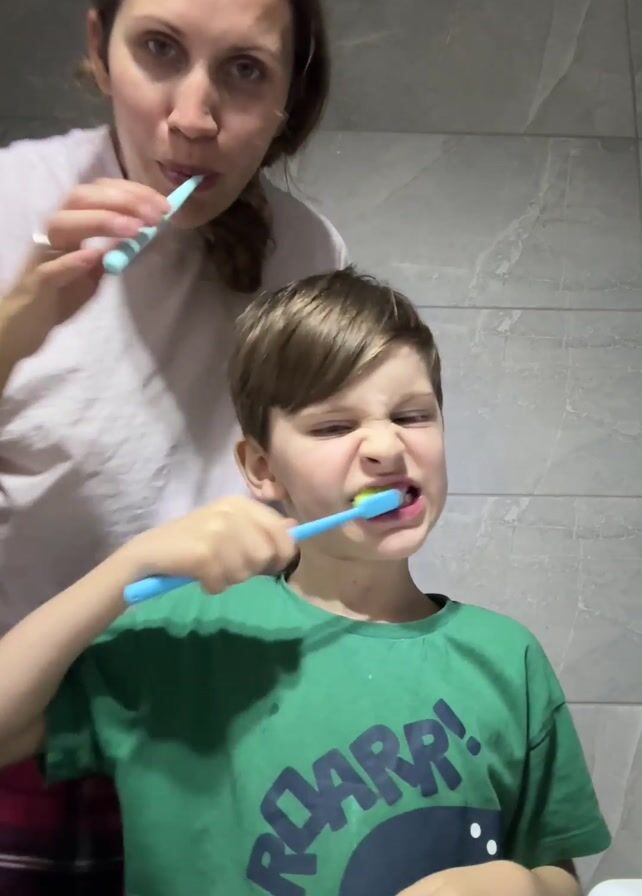 A woman and a young boy are in a bathroom, standing in front of a mirror, brushing their teeth. The woman is standing behind the boy. The woman is wearing a light pink shirt and red and black patterned pajama pants. Her brown hair is pulled back into a ponytail. The boy is wearing a green t-shirt with the word "ROARR!" and a cartoon dinosaur on it. They both are holding blue toothbrushes. The woman briefly puts her fingers behind her head to mimic bunny ears. The bathroom has a grey tile wall.